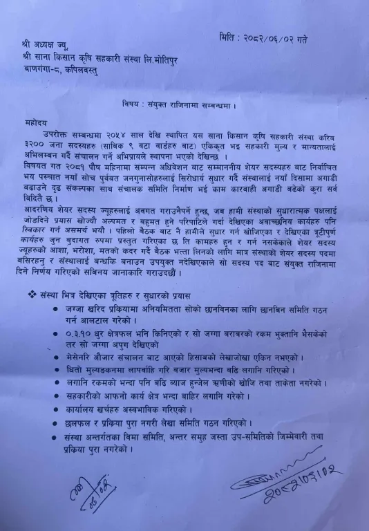 कपिलवस्तुको वाणगंगा नगरपालिका–८, मोतीपुरमा रहेको साना किसान कृषि सहकारी संस्था लिमिटेडका दुई जना सञ्चालक समितिका सदस्यहरूले सामूहिक राजीनामा दिएका छन्। सदस्य राजु अधिकारी (साबिक वडा नं. ५) र बाबुराम भण्डारी (साबिक वडा नं. ६) ले संस्थाको हालको कार्यशैलीप्रति असन्तुष्टि जनाउँदै पदत्याग गरेका हुन्।