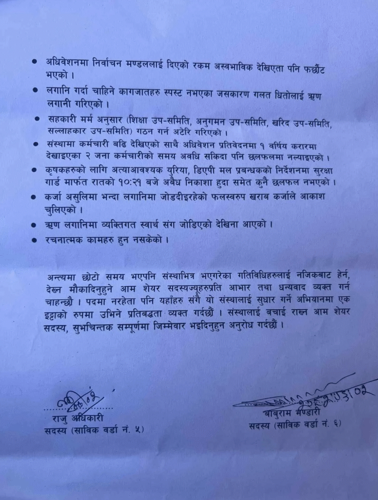 राजीनामा पत्रमा जग्गा खरिद, आर्थिक व्यवस्थापन, हिसाब–किताब र मूल्याङ्कन प्रक्रियामा गम्भीर अनियमितता भएको उल्लेख गरिएको छ। जग्गा खरिदमा रकम बुझाइसकेपछि समेत कब्जा दिन ढिलाइ गरिएको, बजार मूल्यभन्दा बढी मूल्य तोकिएको र ऋण वितरणमा पारदर्शिता नअपनाइएको जस्ता आरोप लगाइएको छ। त्यस्तै, समितिहरू गठन नगरेको, सदस्यहरूको सुझाव बेवास्ता गरिएको, मेसिनरी कारोबारमा अनियमितता देखिएको र लेखापरीक्षण समयमै नगरेको कुरा पनि पत्रमा उठाइएको छ।